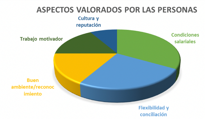 - Flexibilidad y conciliación: Cada vez algo más valorado. Mientras que las personas más jóvenes sobre todo valoran la flexibilidad y posibilidad de teletrabajar una parte de la jornada, las personas con familia valoran las opciones de conciliación.