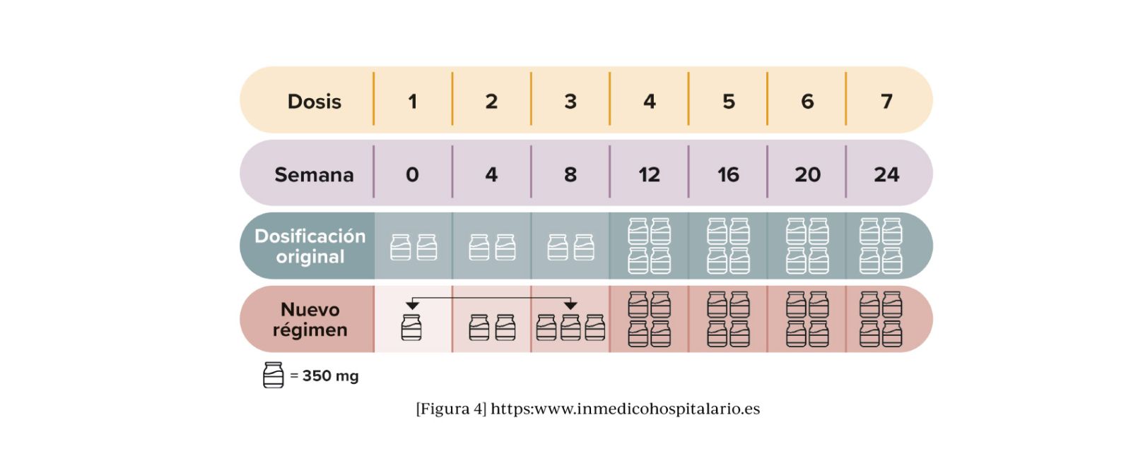El nuevo régimen de dosificación implica una dosificación más gradual. La dosificación nueva es pasar de uno a dos viales de la primera dosis a la tercera dosis administrándose la misma cantidad total del principio activo antes de la semana 24.