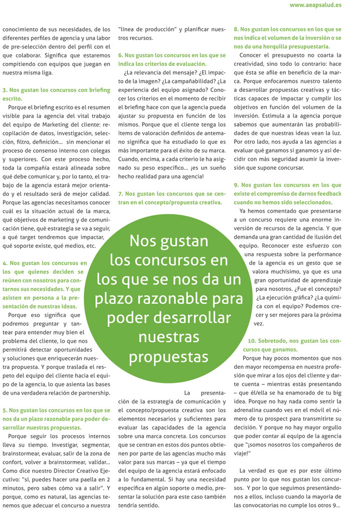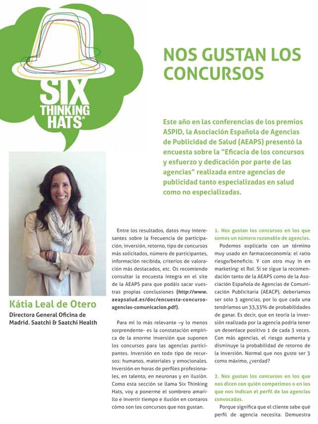 Este año en las conferencias de los premios ASPID, la Asociación Española de Agencias de Publicidad de Salud (AEAPS) presentó la encuesta sobre la “Eficacia de los concursos y esfuerzo y dedicación por parte de las agencias” realizada entre agencias de publicidad tanto especializadas en salud como no especializadas. Entre los resultados, datos muy interesantes sobre la frecuencia de participación, inversión, retorno, tipo de concursos más solicitados, número de participantes, información recibida, criterios de valoración más destacados, etc.